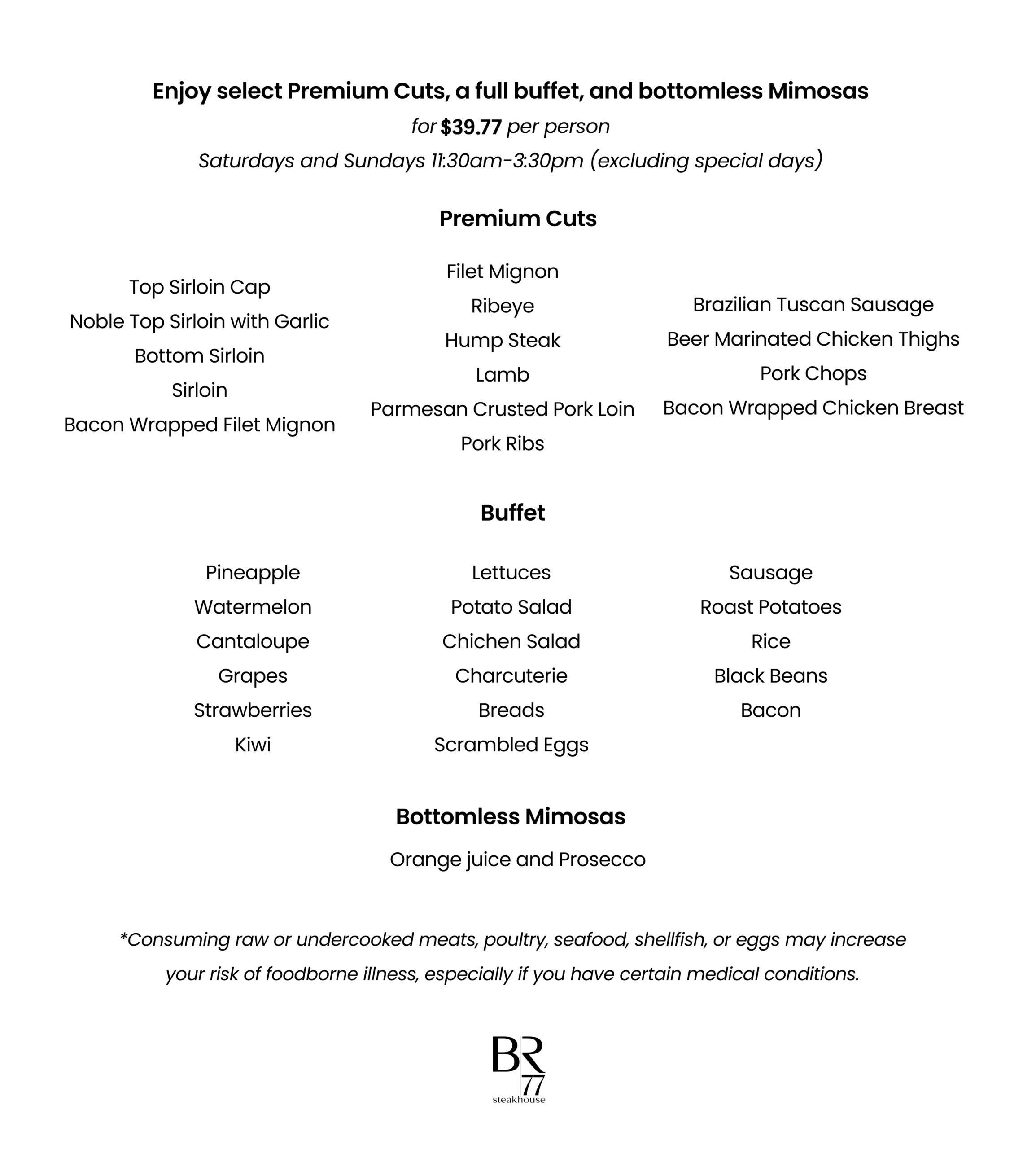 Our offerings include beef ribs, filet mignon, sausages, picanha and more! We also offer seasonal salads, Brazilian cheese bread and an array of other options from our buffet. Our desserts will delight you and you can also enjoy a variety of locally and internationally sourced wines and cocktails!